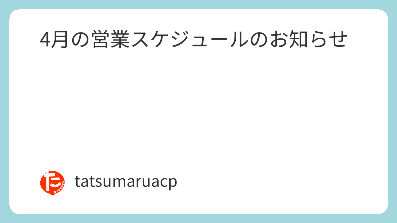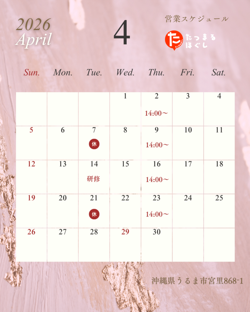 いつも「たつまるほぐし」をご利用いただき、誠にありがとうございます。 4月の営業カレンダーを更新いたしました。